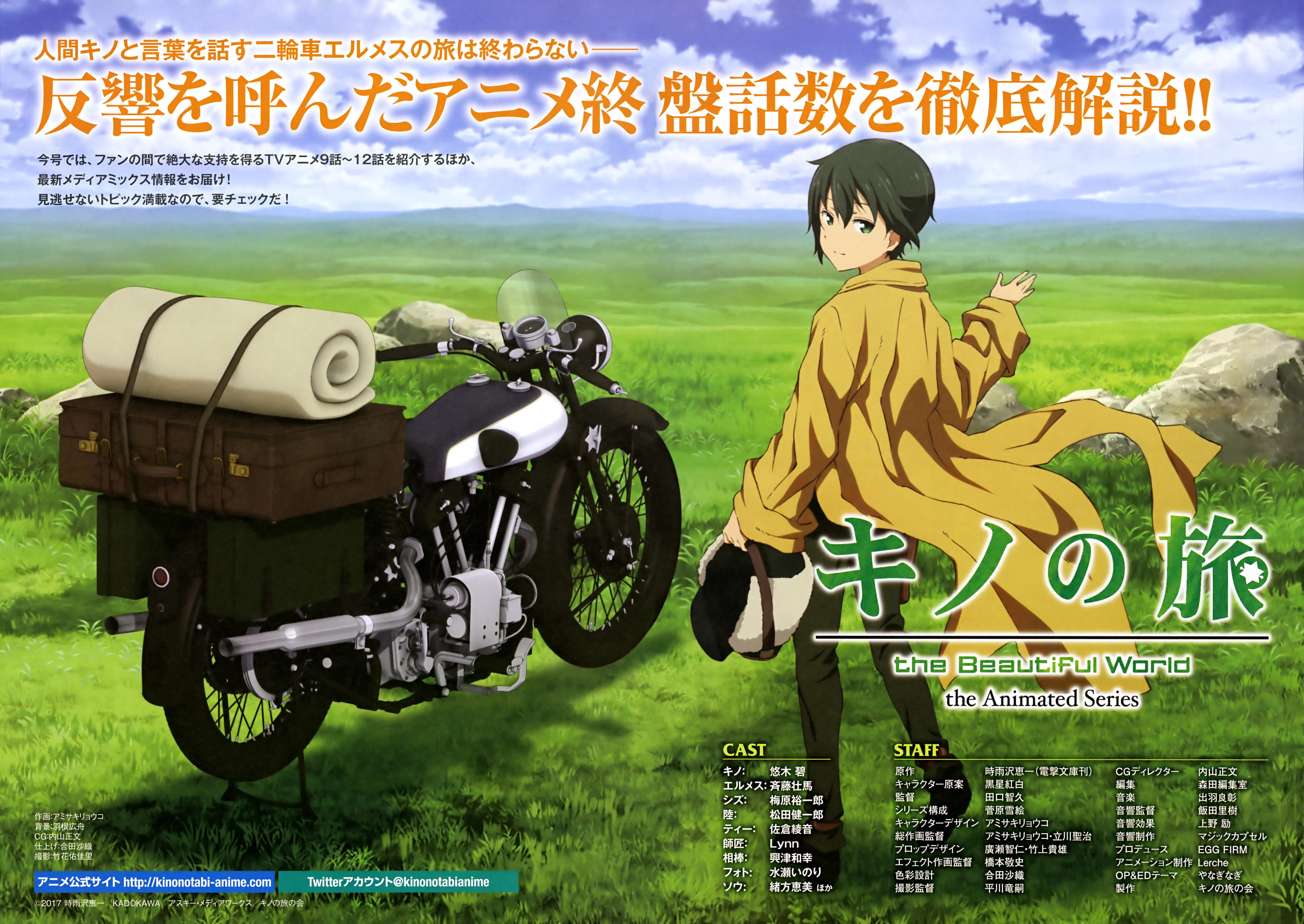 포스트 아포칼립스 치유물. 포스트 아포칼립스 배경 특유의 분위기를 두 여자아이의 여행으로 무겁지 않게 표현하고 있습니다. 특유의 몽환적인 느낌은 키노의 여행과 비슷하나 주제가 사회적이기보다는 철학적인 면에 가까워 힐링물로 접근하기에도 나쁘지 않습니다. 여정 속에 깔려있는 철학적인 질문들은 시청자에게 무언가를 강하게 전달하기보다는 부드럽게 스며듭니다. 무거운 주제를 좋아하는 분에게도 가볍게 힐링하고 싶으신 분에게도 추천할 수 있는 작품입니다.